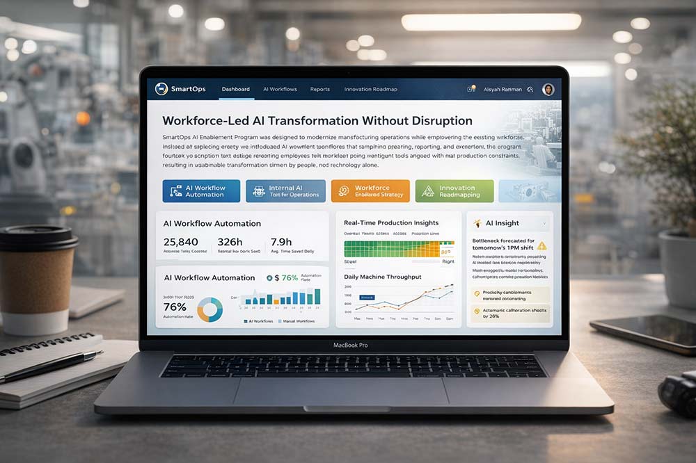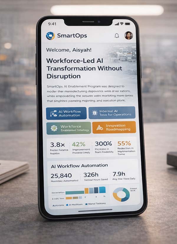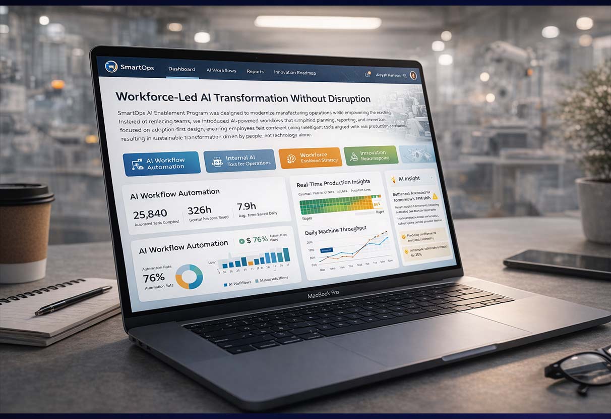 SmartOps AI Enablement Program was designed to modernize manufacturing operations while empowering the existing workforce. Instead of replacing teams, we introduced AI-powered workflows that simplified planning, reporting, and execution. The program focused on adoption-first design, ensuring employees felt confident using intelligent tools aligned with real production constraints, resulting in sustainable transformation driven by people, not technology alone.